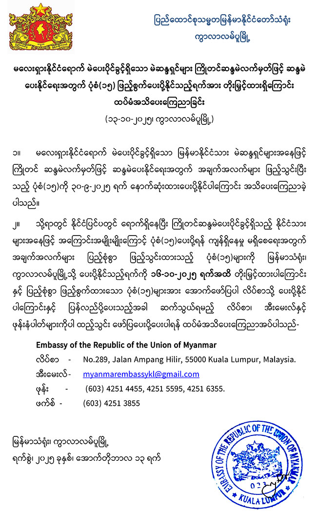 လေးရှားနိုင်ငံရောက် မဲပေးပိုင်ခွင့်ရှိသော မဲဆန္ဒရှင်များ ကြိုတင်ဆန္ဒမဲလက်မှတ်ဖြင့် ဆန္ဒမဲပေးနိုင်ရေးအတွက် ပုံစံ(၁၅) ဖြည့်စွက်ပေးပို့နိုင်သည့်ရက်အား တိုးမြှင့်ထားရှိကြောင်း ထပ်မံအသိပေးကြေညာခြင်း